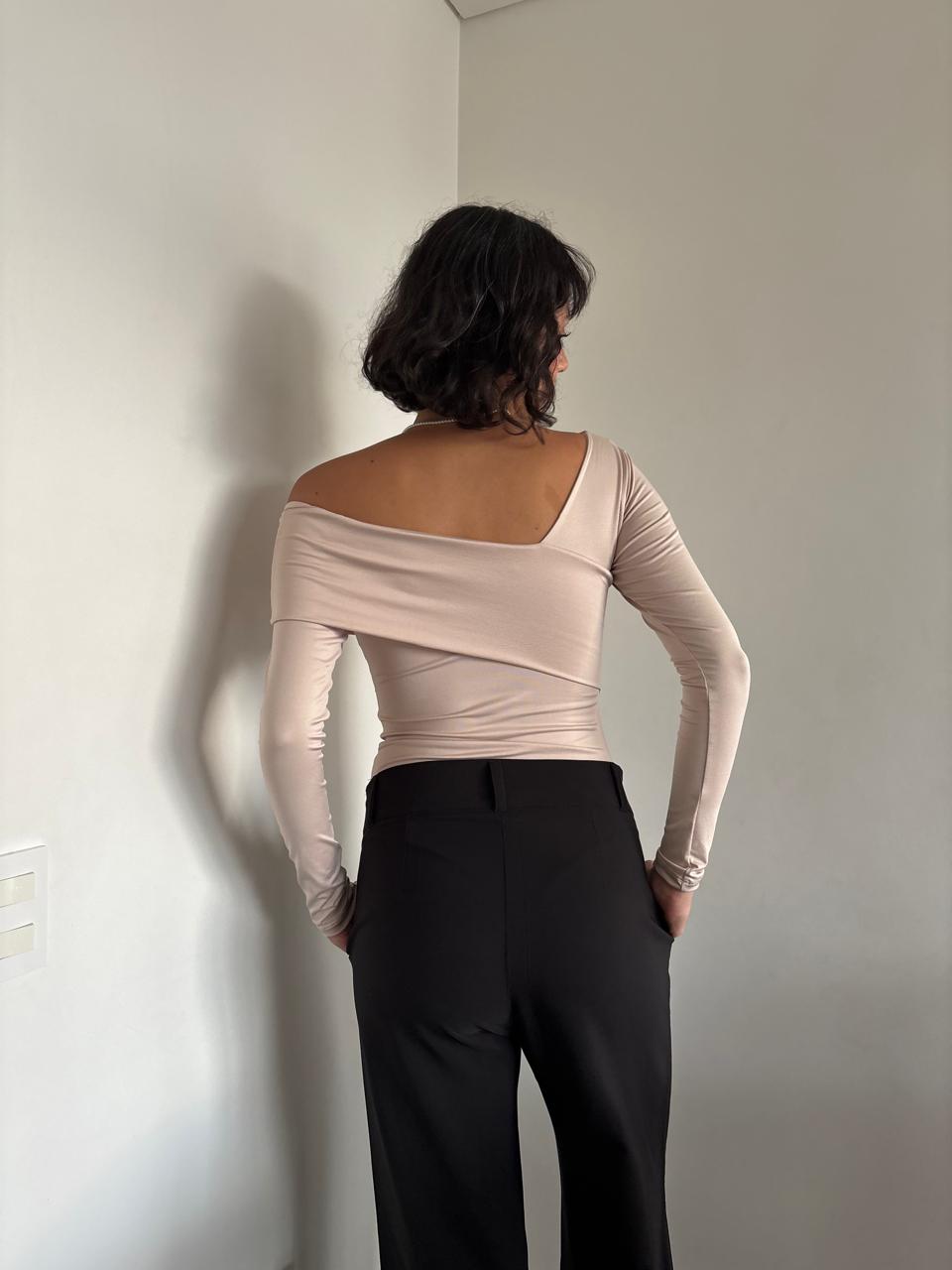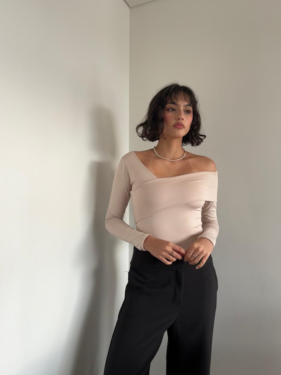 Eleva tu look con nuestro body asimétrico nude, una pieza sofisticada y versátil que realza tu silueta con elegancia. Diseñado con un escote cruzado y hombros descubiertos, este body aporta un toque femenino y moderno a cualquier outfit. Su tela suave y elástica se ajusta perfectamente al cuerpo, brindando comodidad durante todo el día.