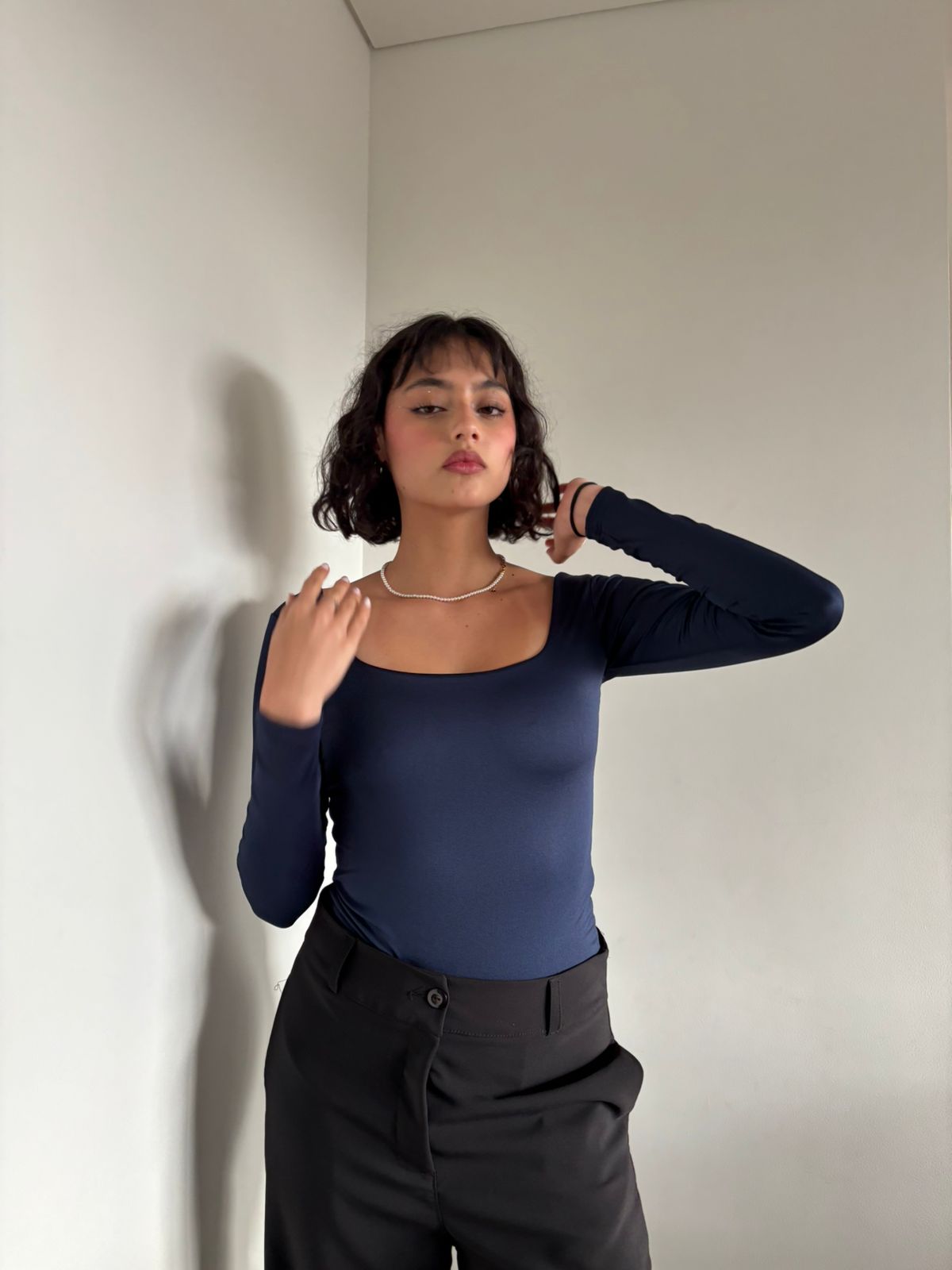 body de escote cuadrado en azul marino es una prenda esencial en tu clóset. Su diseño de líneas limpias y manga larga realza la figura con un ajuste cómodo y elegante.