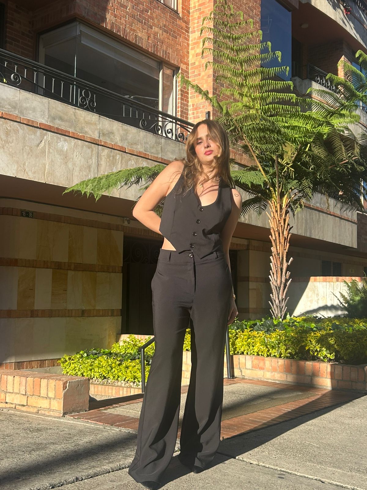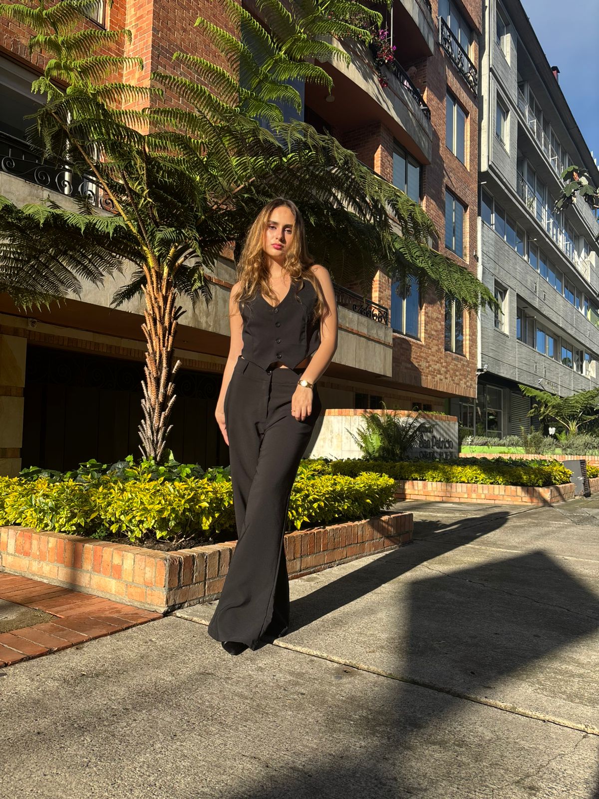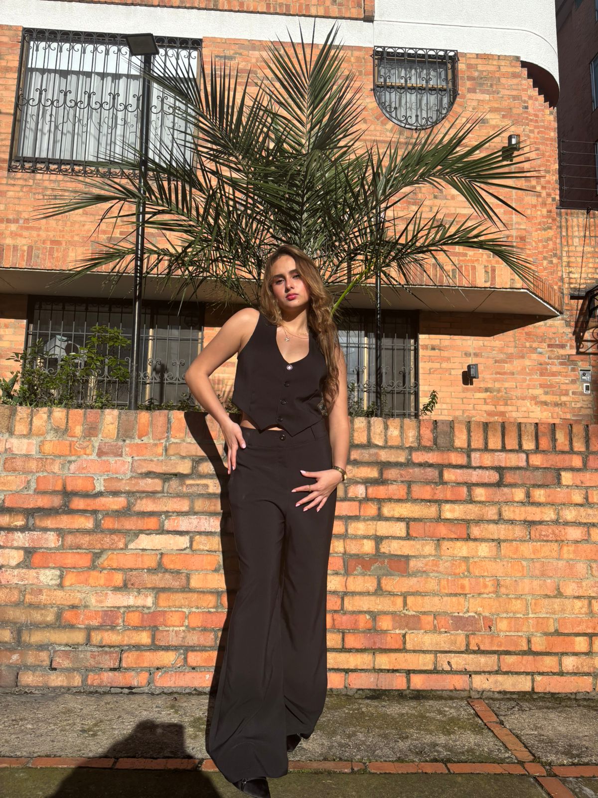 Este conjunto sastre en negro es la combinación perfecta entre elegancia clásica y estilo moderno. Compuesto por un chaleco entallado de escote en “V” y un pantalón tipo palazzo de tiro alto, este set estiliza la figura y aporta un look poderoso, ideal para destacar en cualquier ocasión.