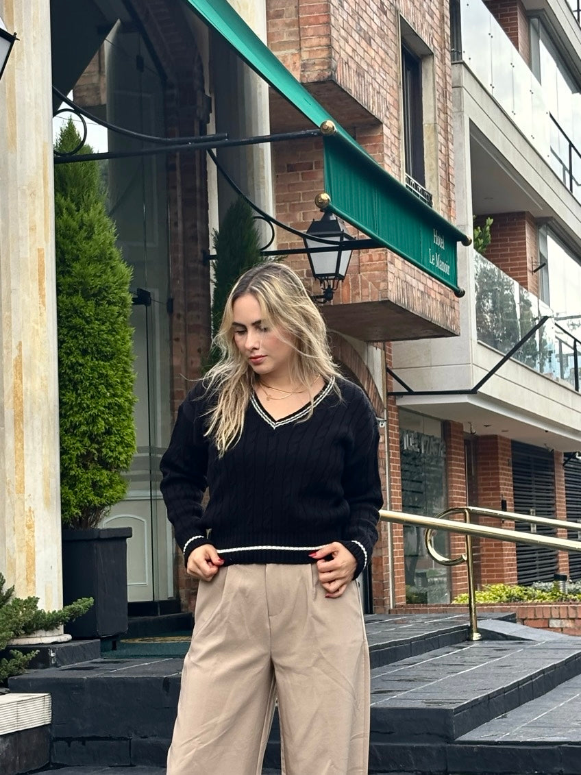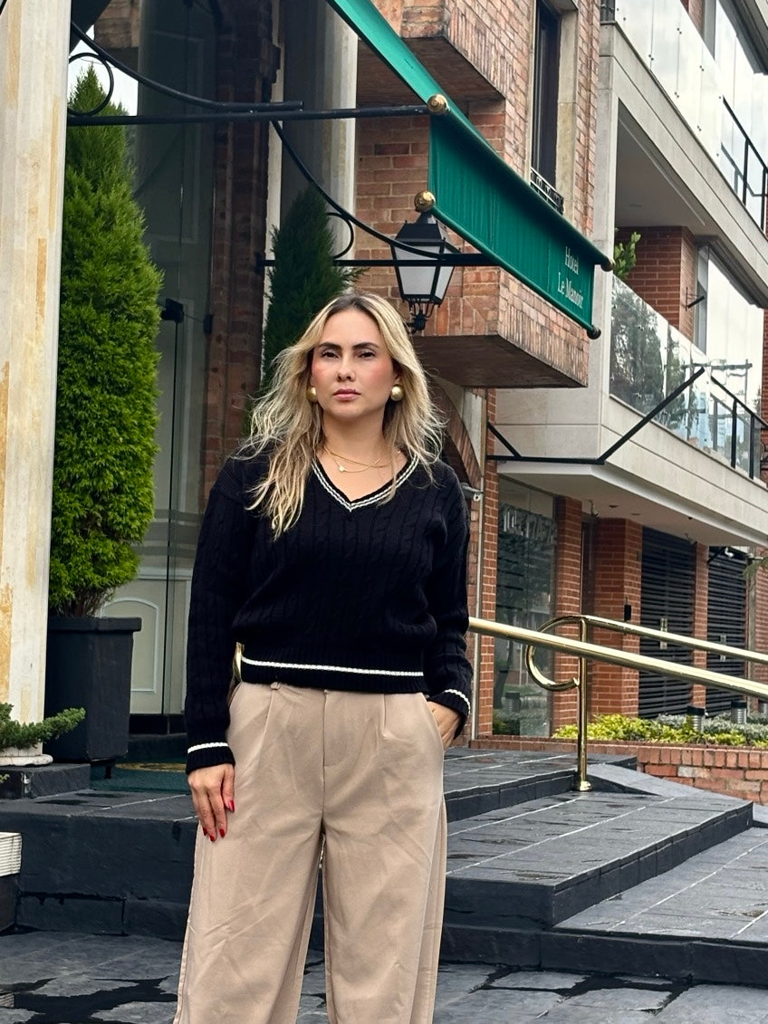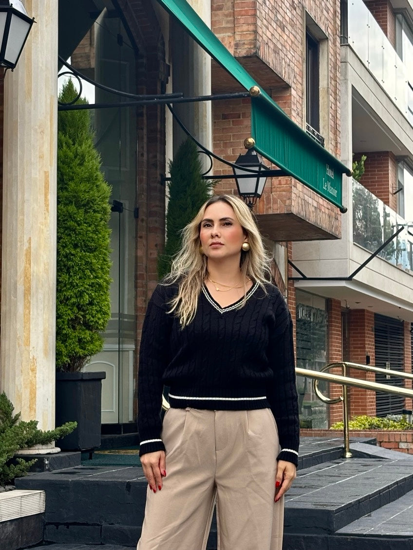 Un clásico reinventado. Este sweater tejido en punto trenzado, con escote en V y detalles en contraste, es la pieza perfecta para lograr un look effortless y sofisticado. Su diseño atemporal con vibra académica lo convierte en un must para los días frescos, ideal para combinar con todo.