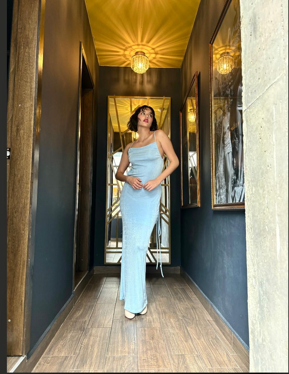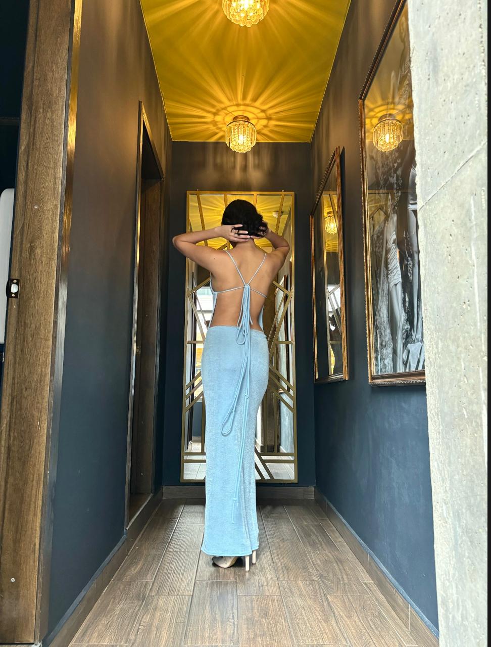 Un vestido largo sofisticado con espalda descubierta de color azul. Destaca por su corte fluido que cae suavemente hasta el suelo, brindando una sensación de gracia y movimiento. El color azul le otorga un toque de frescura y elegancia, mientas que el detalle de la espalda descubierta agrega un toque sensual y moderno.